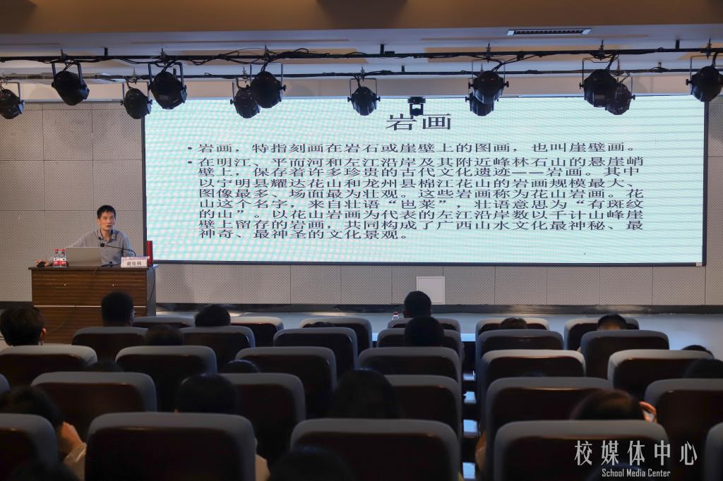 讲座中,黄教授围绕“广西山水文化”的核心主题,首先阐释山水和山水文化的含义,旁征博引,通过相关案例让学生了解广西独特的山系与水系。同时着重选取了广西的山歌、山水诗、山水画、山水摩崖、山水教育五个山水文化类型进行内涵解读,并运用了许多富有特色、多样的案例与典故向同学们展示了广西优美的自然山水景光与浓厚的历史人文气息。讲座最后,黄教授寄语同学们提高保护和有效利用广西丰厚的自然遗产,加强广西山水文化研究,去伪存真、去粗取精、弃其糟粕,取其精华,在现代文明的指引下,对广西传统山水文化进行创造性转化。