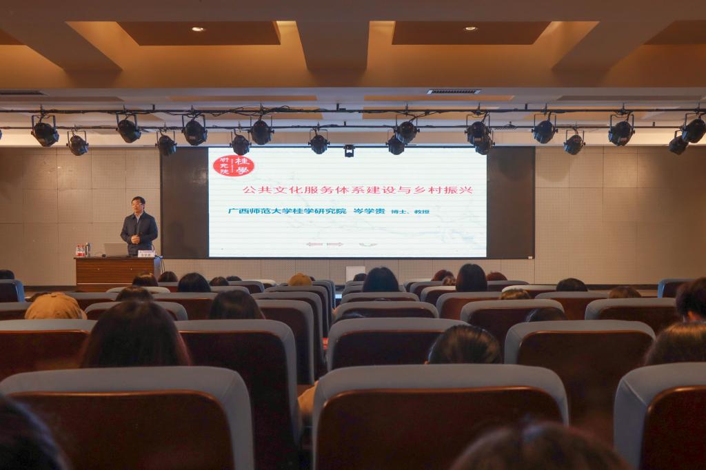 为庆祝中国共产党成立100周年,致力弘扬优秀传统文化,增强当代大学生文化素养,提升民族文化自信。5月19日下午,由教学科研处和广西高校重点人文社科研究基地桂学研究院共同举办的“桂学研究”系列专题讲座迎来了第六讲。本场讲座邀请到广西师范大学文学院岑学贵教授为大家讲授《公共文化服务体系建设与乡村振兴》。全校各专业师生代表200余人到场聆听讲座,讲座同时通过网络视频方式向社会各界进行同步直播。