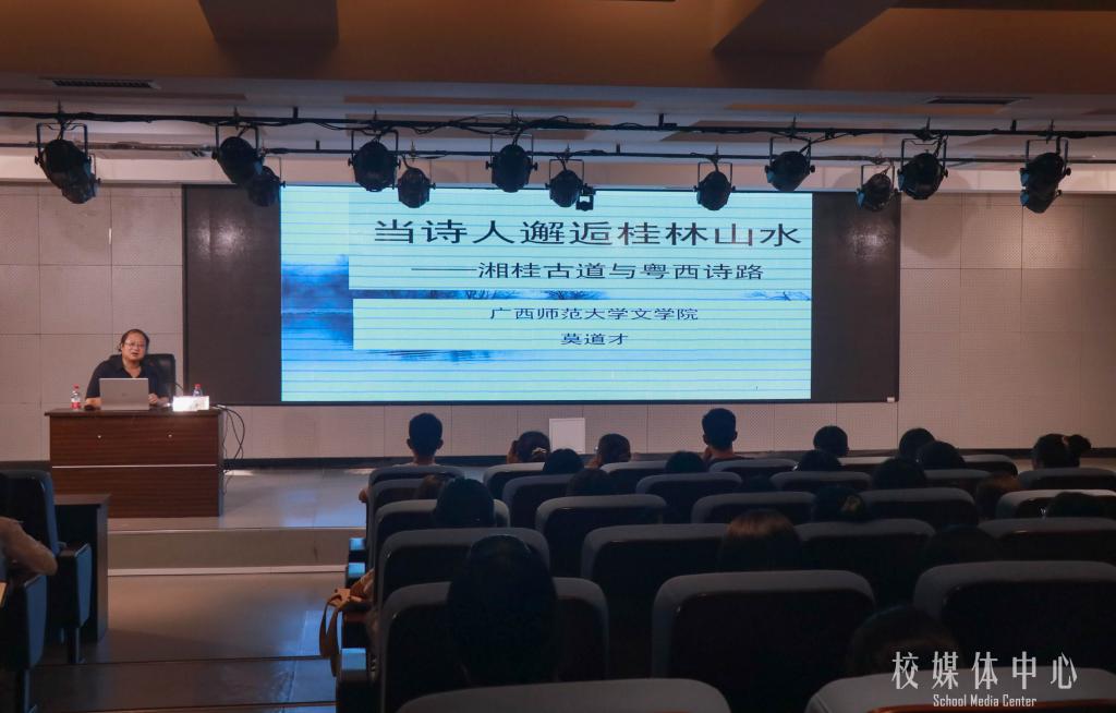 为庆祝中国共产党成立100周年,致力弘扬优秀传统文化,增强当代大学生文化素养,提升民族文化自信。5月26日下午,由广西师范大学漓江学院教学科研处和广西高校重点人文社科研究基地桂学研究院共同举办的“桂学研究”系列专题讲座迎来了第八讲。本场讲座的主题是“当诗人邂逅桂林山水——湘桂古道与粤西诗路”,主讲嘉宾为广西师范大学文学院/新闻与传播学院的博士生导师莫道才教授,全校各专业师生代表200余人到场聆听讲座,讲座同时通过网络视频方式向社会各界进行同步直播。