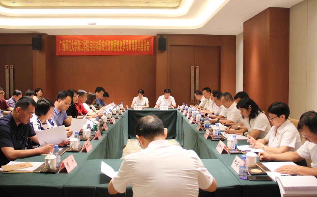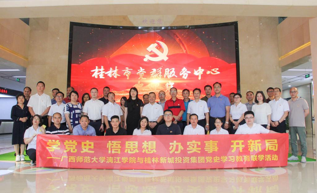 6月8日下午,我校党委理论学习中心组(扩大)与桂林新城投资集团党总支在桂林市临桂新区开展党史学习教育联学活动。桂林新城投资集团党总支书记、董事长、我校董事长周道林,校党委书记唐文红,校党委副书记、校长杨树喆出席活动。校党委理论学习中心组其他成员、非党员校领导、各党总支书记、二级学院院长等和新城投资集团党总支班子、董事会、监事会、经营班子参与联学。