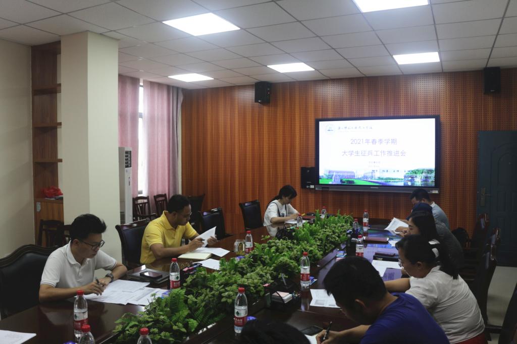 6月21日下午,我校在知善楼8315会议室召开2021年春季学期大学生征兵工作推进会。校党委副书记、纪委书记、副校长邓志平,各二级学院分管学生工作副书记,学生事务部相关人员参加会议。会议由学生事务部副部长、校团委书记王瑞主持。