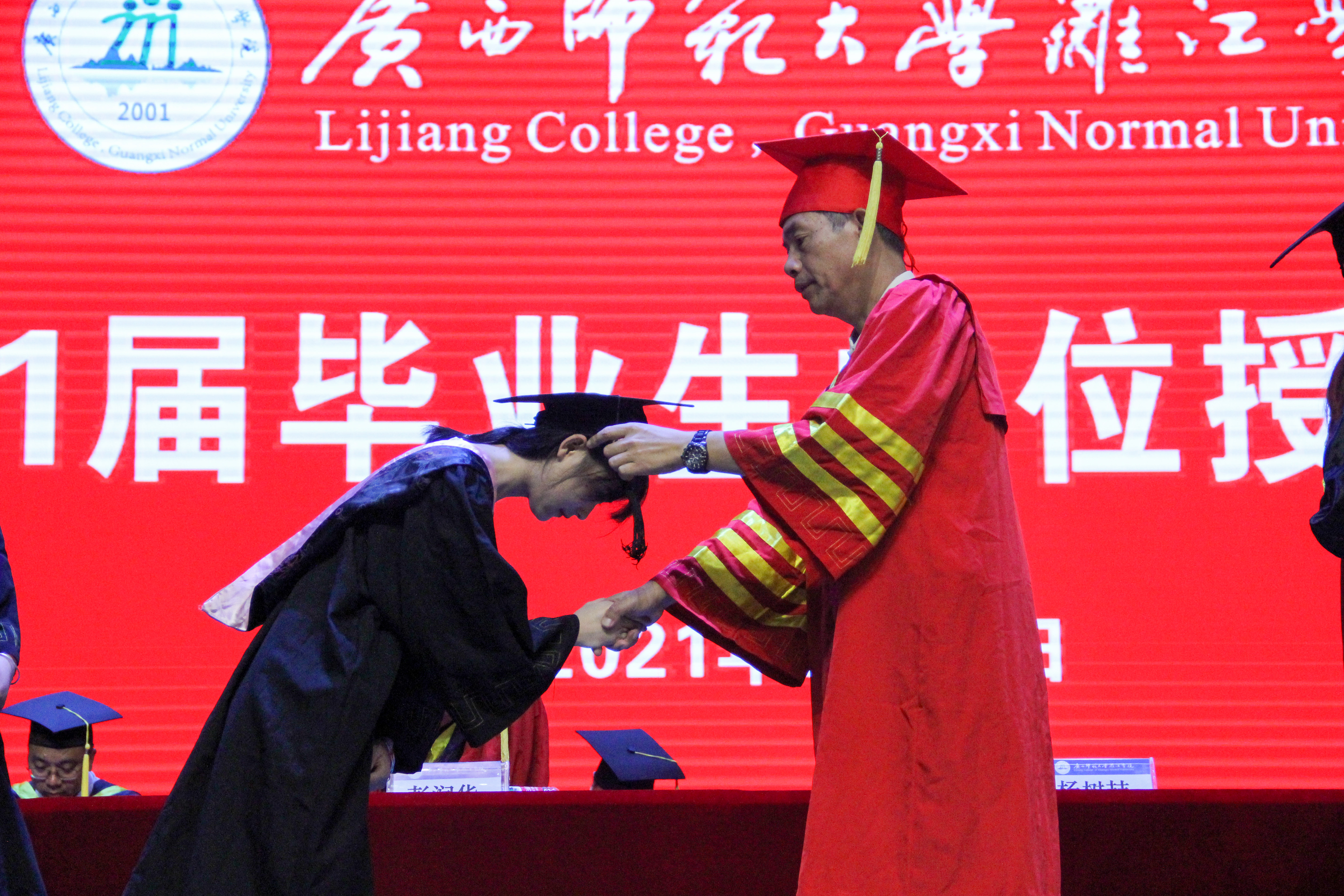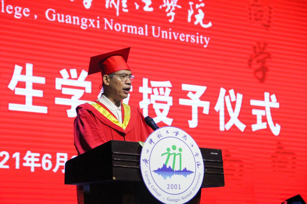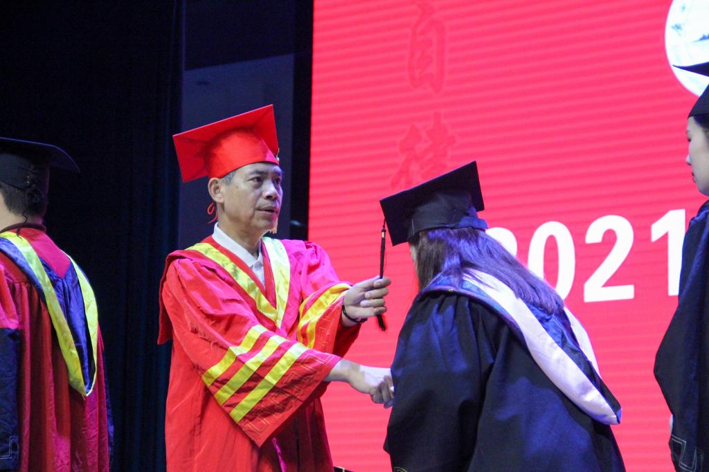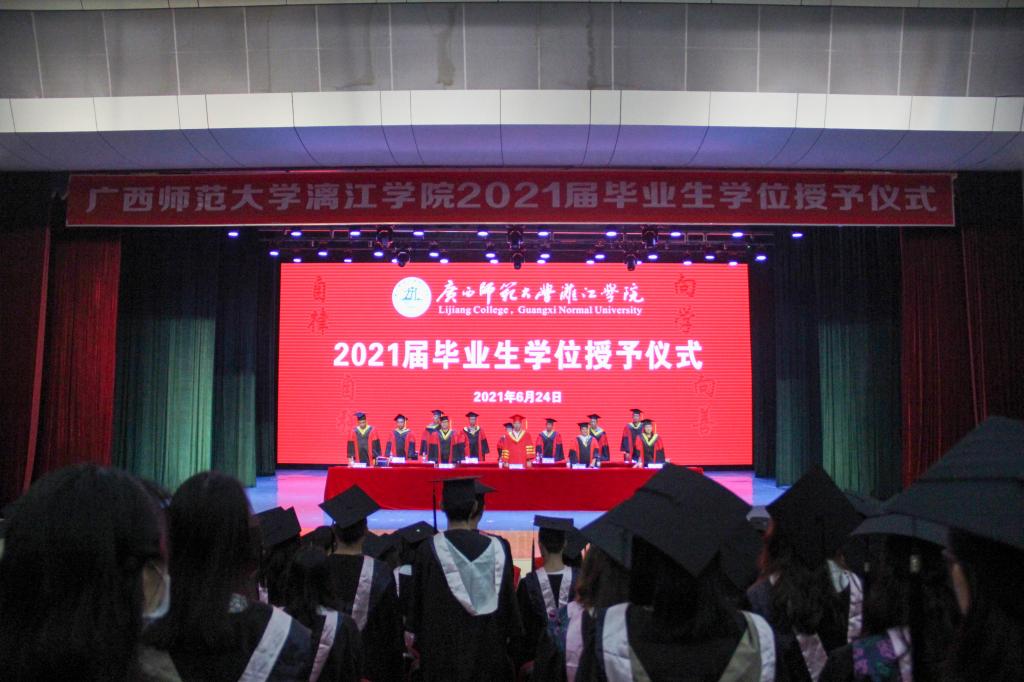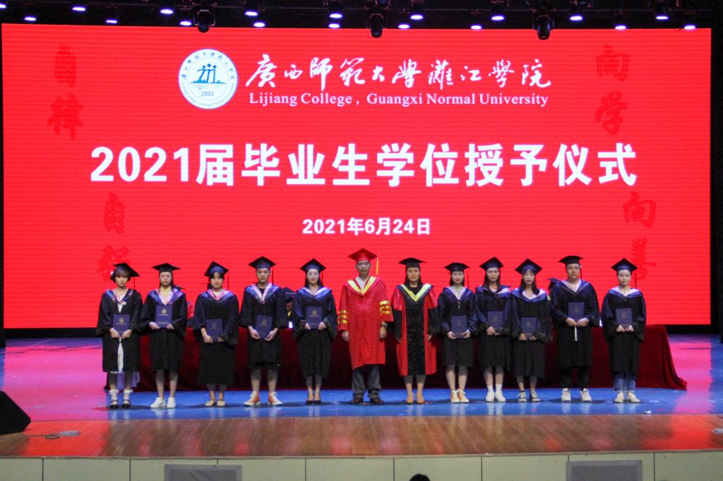 各场次仪式活动在雄壮的国歌声中正式开始,校长、学位评定委员会主席杨树喆首先郑重宣读了《关于授予李健明等2854名毕业生学士学位的决定》(漓院政教学〔2021〕44号)。随后,意气风发的毕业生们依次走上主席台,杨校长和各二级学院院长分别为毕业生们拨穗正冠,送上祝福,并与同学们合影留念。