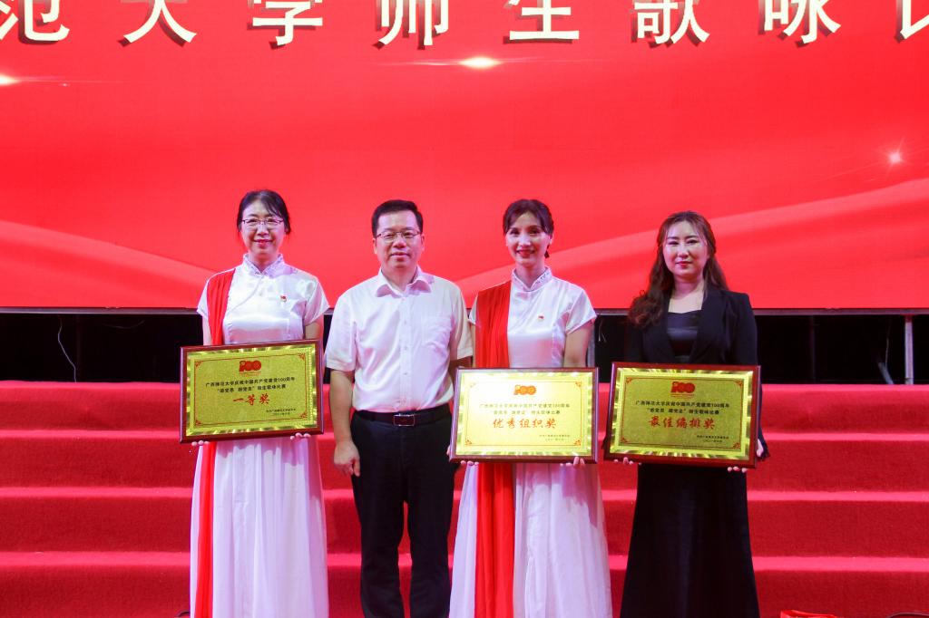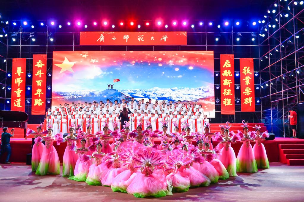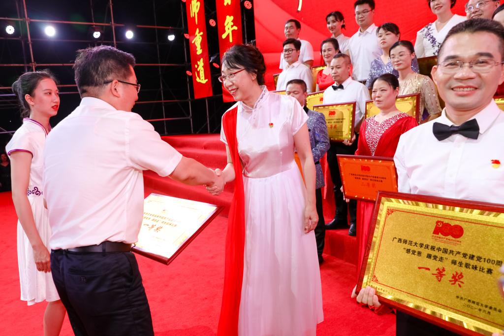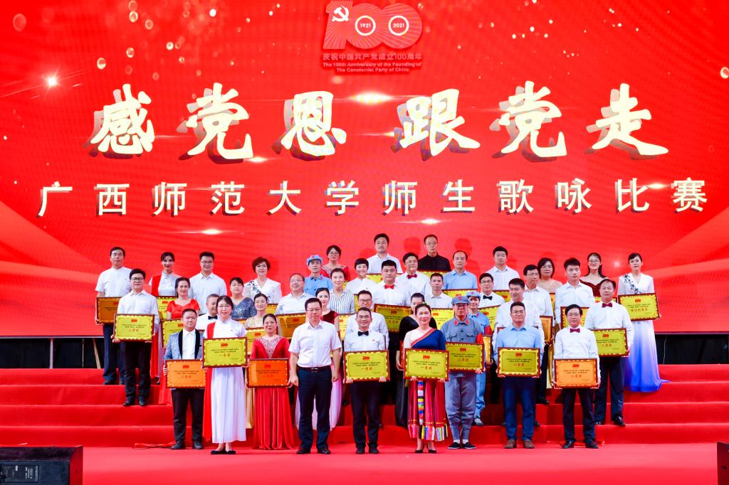 6月25日晚,广西师范大学庆祝中国共产党建党100周年“感党恩 跟党走”师生歌咏比赛在广西师大雁山校区田径场举行。由我校全体校党委委员和师生代表组成的100人合唱团演唱的参赛曲目《天耀中华》,一举获得一等奖、优秀组织奖和最佳编排奖三项大奖。
