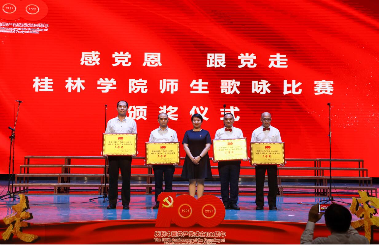 6月29日晚,我校在弘善讲堂隆重举行庆祝中国共产党成立100周年表彰大会暨“感党恩 跟党走”师生歌咏比赛。学校董事长周道林,校领导唐文红、杨树喆、邓志平、祝芸芸、刘文革、杨庆庆出席活动。学校党委委员、各党总支书记、各学院院长、全体党支部书记、各职能部门负责人、桂林新城投资开发集团有限公司相关部门的领导及师生代表500余人参加了此次活动。表彰大会由校党委副书记、纪委书记、副校长邓志平主持。
