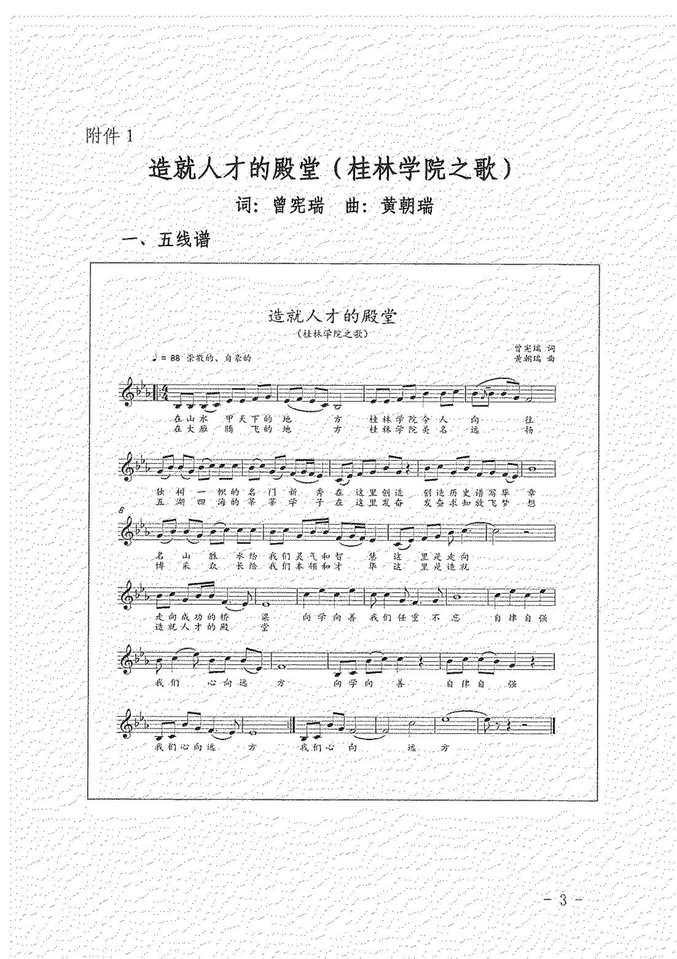 《通知》指出,由曾宪瑞作词、黄朝瑞作曲的《造就人才的殿堂(广西师范大学漓江学院之歌)》,自2014年被确定为广西师范大学漓江学院校歌以来的广泛传唱中,逐渐被广大师生认可,随着广西师范大学漓江学院获批转设为桂林学院,根据广大师生的意见和建议,同时征得原词作者同意,对部分歌词作了修改完善,更名为《造就人才的殿堂(桂林学院之歌)》,并确定为桂林学院校歌。