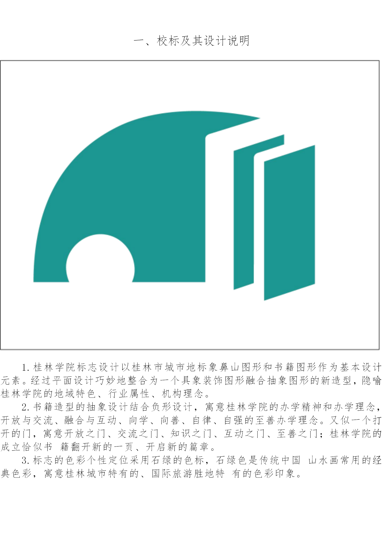新公布的桂林学院视觉形象标识包括校标及其设计说明、各种校标款式、校徽及其设计说明、各种校徽款式4大部分,具体如下: