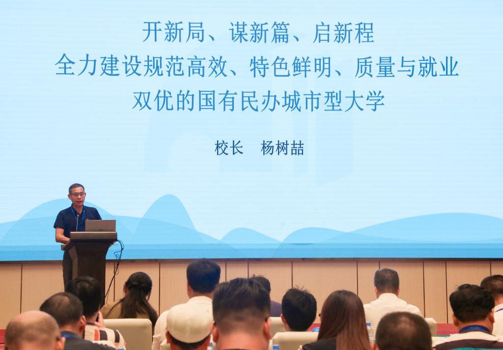 校长杨树喆作了题为《开新局、谋新篇、启新程,全力建设规范高效、特色鲜明、质量与就业双优的国有民办城市型大学》的主题报告