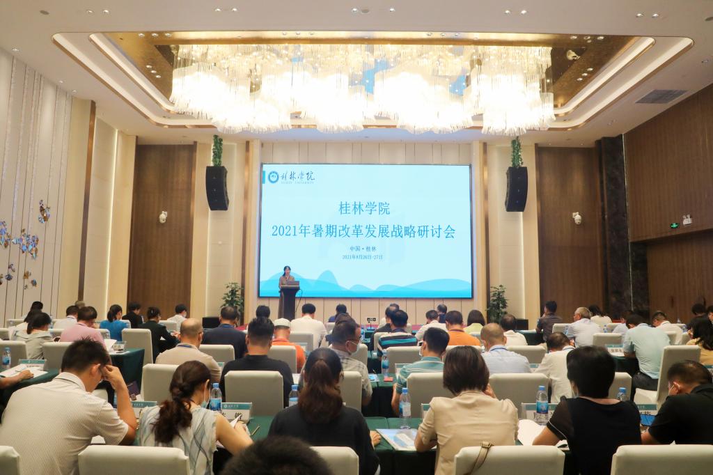 8月26-27日,桂林学院2021年暑期改革发展战略研讨会在桂林市宏谋大酒店召开。会议主题和任务是:深入学习贯彻习近平总书记在庆祝建党100周年大会上的重要讲话精神,结合《教育部关于同意广西师范大学漓江学院转设为桂林学院的函》和《桂林学院章程》有关精神,聚焦学校“十四五”发展规划和2035年远景目标,开新局、谋新篇、启新程,全力建设规范高效、特色鲜明、质量与就业双优的国有民办城市型大学。