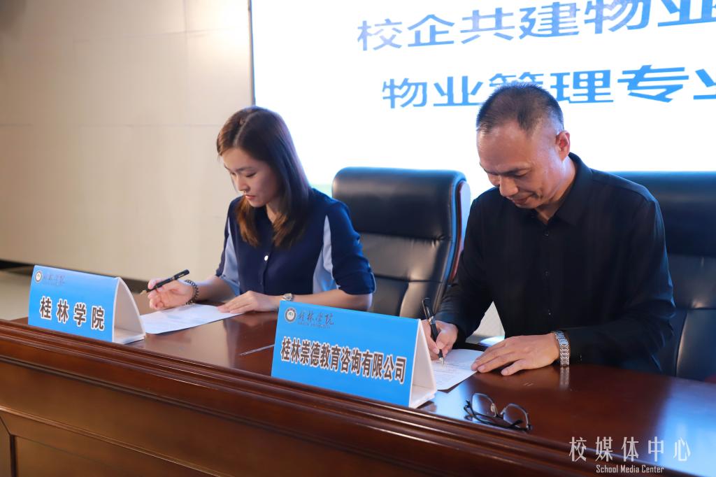 杨校长强调,走校企合作、产教融合的转型发展之路,是学校前身广西师范大学漓江学院的优良传统,更是后继者桂林学院未来发展的必然选择。截止2021年,学校先后与多家国内知名企业开展校企合作,共建了“名淘电商学院”“融媒体学院”“粤嵌电子工程学院”“东软软件学院”“中软国际大数据产业学院”等产(行)业学院,为培养适应区域经济社会发展所需要的应用型、技术技能型人才奠定了一定的基础。物业管理专业是我校去年向教育部备案、今年首次面向全国招生的专业,也是目前广西高校中唯一开设的本科专业。今天,我们与桂林崇德教育咨询有限责任公司签订共建物业管理专业协议,标志着我校的转型发展又迈上了新的台阶。希望校企双方进一步加强交流与沟通,本着“互相学习、优势互补、资源共享、合作共赢、共谋发展”的原则,共同打造校企合作、产教融合的新典范。