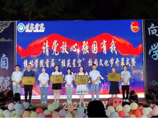 晚会中,学生事务部为首届“桂苑星空”校园文化节参与单位授旗,并为我校2020-2021学年春季学期“青年大学习”网上主题团课先进集体颁奖。