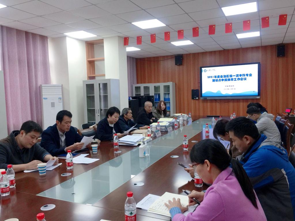 为做好2021年自治区级一流本科专业建设点申报工作,11月3日,学校在知善楼8312会议室召开2021年度自治区级一流本科专业建设点申报推荐工作会。会议评审由学校首席教授周世中、韩明、傅广生三人组成专家组,教学科研处、各学院院长及副院长、各申报专业负责人等参加本次会议,会议由杨庆庆副校长主持。