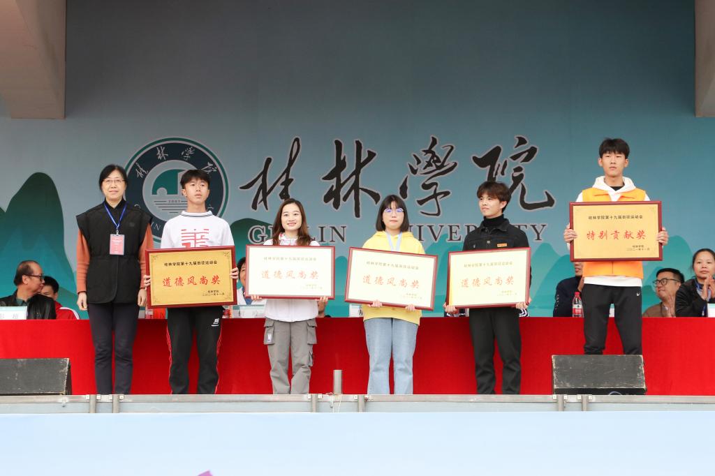 本届校运会副总裁判长李毅宣布比赛团体总分成绩;道德风尚组副组长王瑞宣布道德风尚奖评比结果和特别贡献奖单位。出席领导分别为获得乙组团体总分前两名、甲组团体总分前三名、道德风尚奖和特别贡献奖单位颁奖。