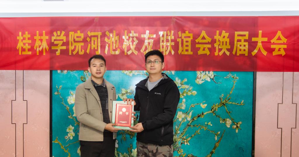 会上,机关党总支书记、后勤保卫处处长李久华,语言文学学院党总支书记江仿,后勤保卫处副处长付健分别向河池校友联谊会新一届理事会成员颁发聘书。会长由韩鑫担任,秘书长由罗懿担任,副会长由张登飞担任。
