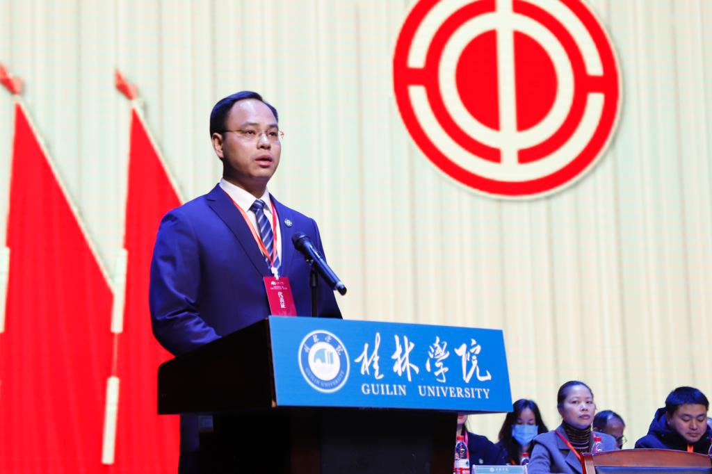 董事长周道林代表桂林新城投资开发集团有限公司、校董事会作讲话。他表示,新城投资集团、校董事会将以此次“双代会”的选举为契机,进一步推进学校的民主建设,不断加大对工会等校内群团组织的支持力度,切实保障教职工参与、监督学校决策的权利。希望“双代会”各位代表和新当选委员提高政治站位,增强服务意识,切实做好学校和广大教职工之间的桥梁和纽带,团结凝聚全体教职工努力完成《桂林学院办学发展“十四五”规划纲要》(征求意见稿)提出的“四大任务”和“六项工程”,为全面建成“校市双向赋能融合发展新典范的国有民办城市型大学”而努力奋力。