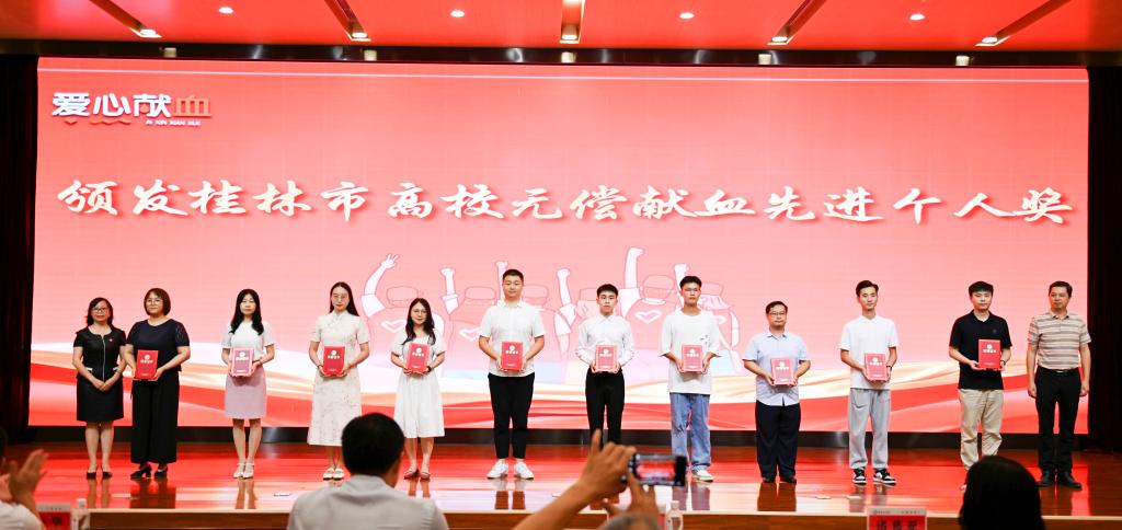 表彰会上还为获得“桂林市高校无偿献血先进个人”、“桂林市高校无偿献血公益奖学金”、“桂林市高校无偿献血奉献奖”的个人颁奖。我校张紫晨、刘明菲、余新毅等3名师生获“2021年度桂林市高校无偿献血先进个人”,包淑娟、李杰等5位同学获“2021年度桂林市高校无偿献血公益奖学金”,雒腾、严秀洁等33位同学获“2021年度桂林市高校无偿献血奉献奖”。
