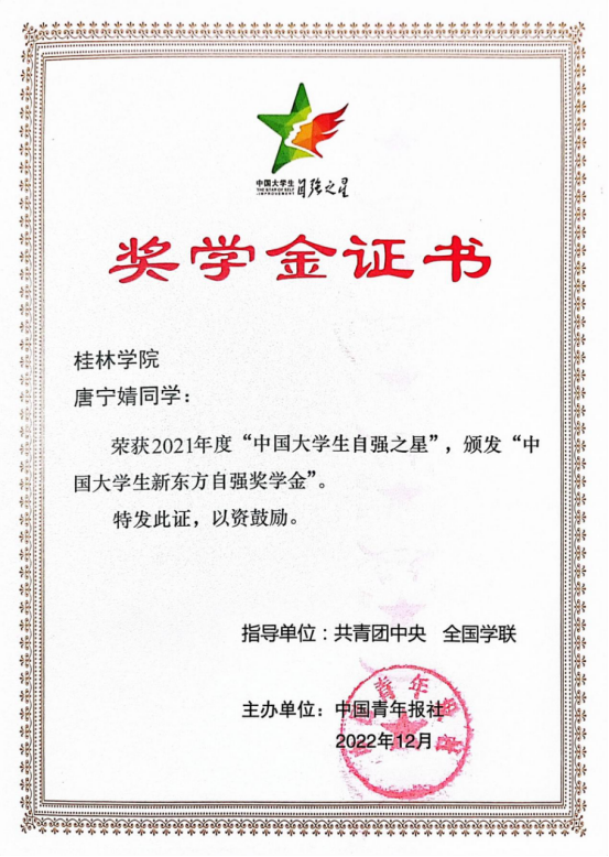 我校人文学院2020级唐宁婧同学荣获2021年度“中国大学生自强之星”奖学金