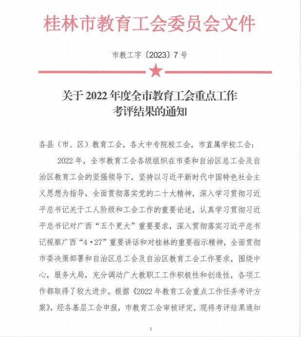 近日,桂林市教育工会委员会下文授予我校工会“2022年度全市教育工会先进工作单位”。