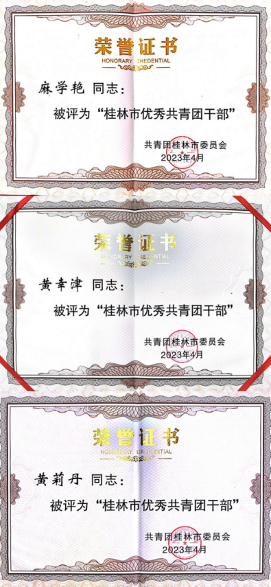 近日,共青团桂林市委对2022年度桂林市“五四”评优作出表彰决定,我校黄莉丹、黄幸津、麻学艳三位老师荣获“桂林市优秀共青团干部”荣誉称号;韦钠、李素仪两名同学获“桂林市优秀共青团员”荣誉称号;理工学院团总支、金融与法律学院2020级法学团支部获“桂林市五四红旗团支部(总支)”荣誉称号。