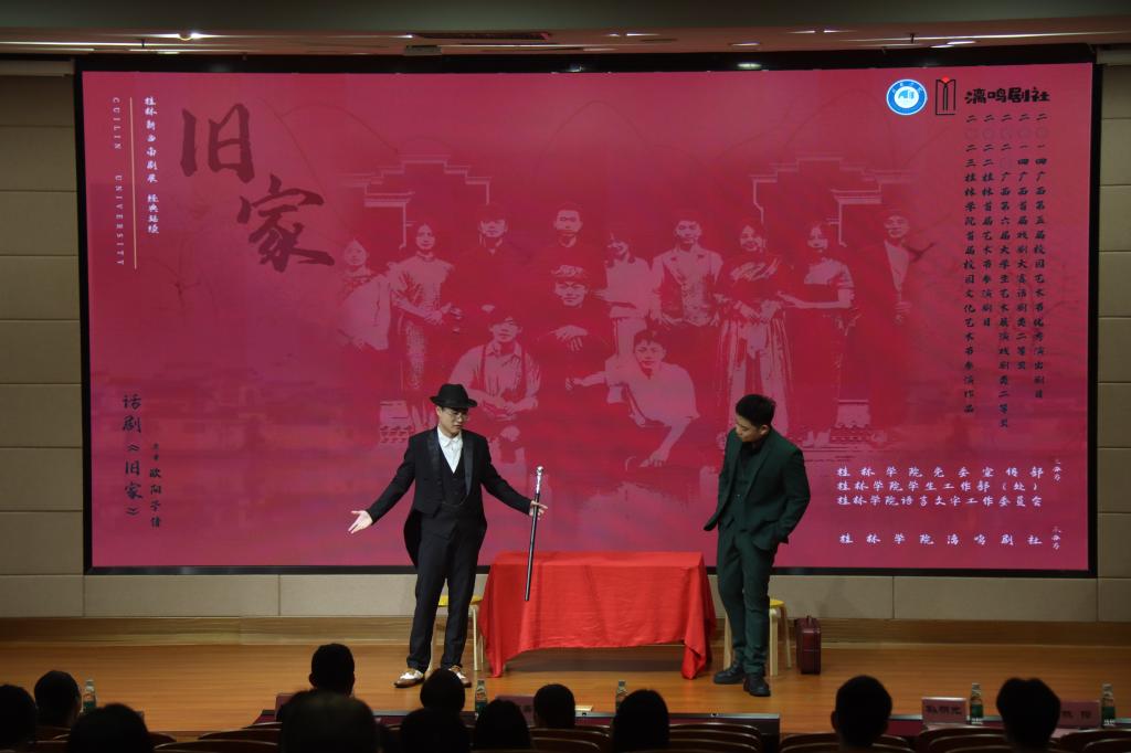 随后,我校学生上演抗战话剧《旧家》选段。校语委漓鸣剧社学生演员的演绎,再现了桂林“抗战文化城”的精神风貌,真切表达出当时人们想要摆脱“旧”家、建立“新”家,探索救家、救国务实之路的愿景。本次演出彰显了我校在传承中华优秀传统文化、发掘桂林地方抗战文化道路上可喜的物化成果。演出令人如临其境,博得台下阵阵掌声。