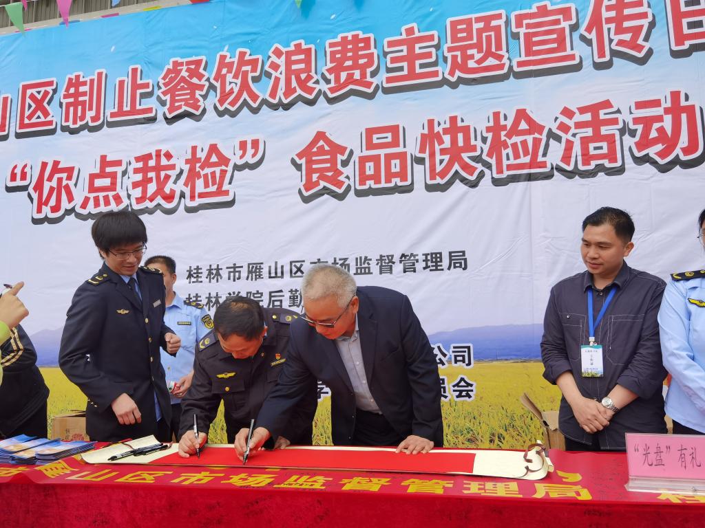 为全面贯彻落实习近平总书记对制止餐饮浪费行为作出的重要指示精神,营造厉行节约、反对浪费的社会新风尚。5月23日,学校联合桂林市雁山区市场监督管理局、桂林市食品药品检验所在乐善食府广场开展制止餐饮浪费暨“你点我检”食品快检宣传活动。桂林市雁山区市场监督管理局局长游晓军、副局长夏桂春,学校副校长刘文革、后勤保卫处相关负责人出席活动。
