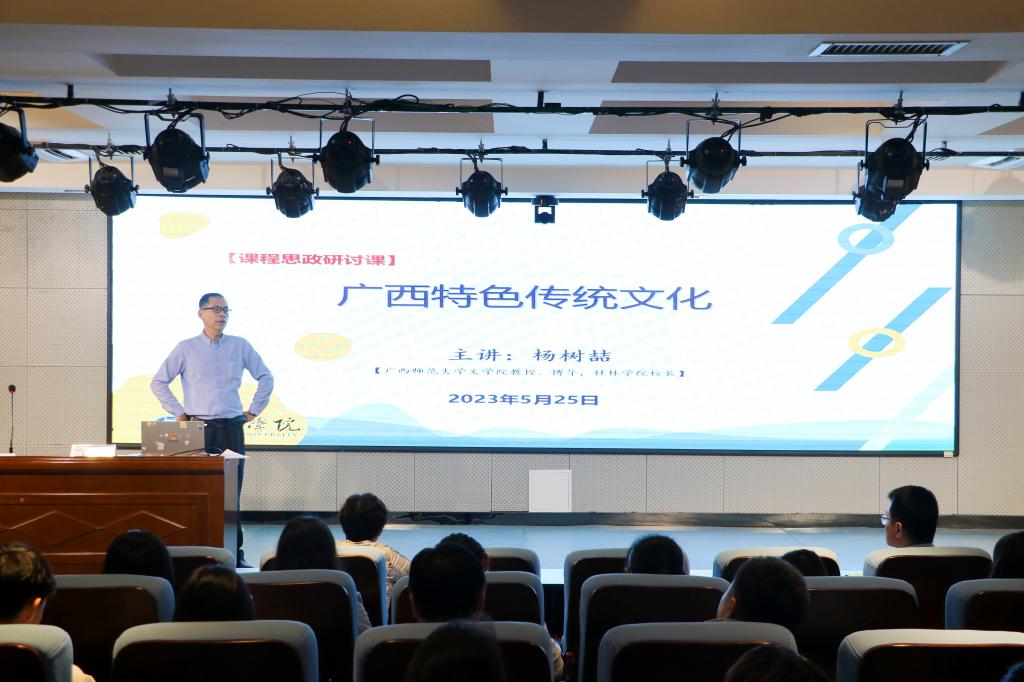 5月25日上午,随着一声响亮的“上课”,一堂别开生面的课程思政示范研讨课在至善讲堂开讲了。校长杨树喆以“广西特色传统文化”为题,带领台下由各二级学院分管副院长、基层教学组织及校级以上课程思政示范课教学团队负责人、教务与产教融合处相关人员等组成的“学生”感受广西特色传统文化的博大精深与魅力、领悟课程思政的本质内涵和要求。