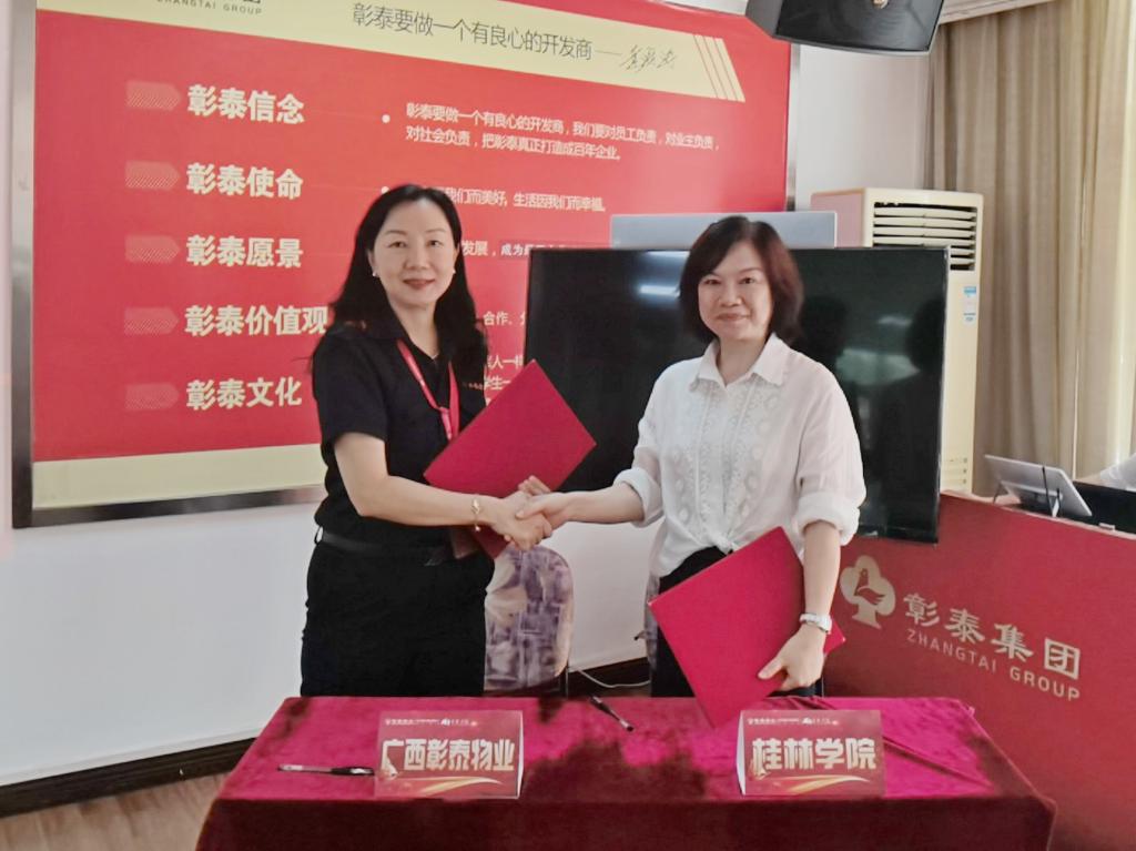 为了加强校企合作,提升物业管理专业的教育质量和水平,学校与广西彰泰物业服务集团有限公司于5月26日下午在位于康桥半岛项目的彰泰物业总部举行了物业管理专业实践教学基地签约与揭牌仪式。副校长祝芸芸、彰泰物业董事长刘颖等双方领导与相关人员,以及2022物业管理专业的59名学生出席了本次活动。