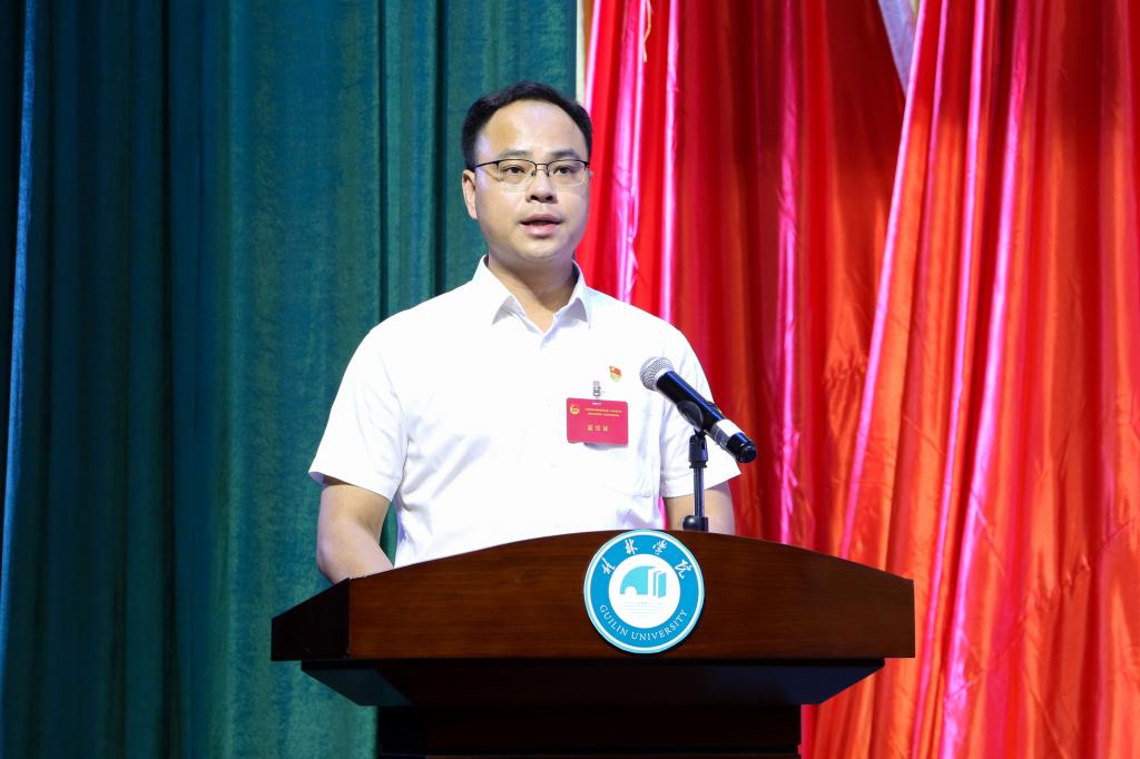 团桂林市委书记文昕代表共青团桂林市委向大会的召开表示热烈的祝贺,向我校广大团员和青年学生致以亲切的问候。他充分肯定了我校共青团、学生会在思想引领、素质提升、校园文化和自身建设等方面取得的成绩。希望各级团组织要坚守党的青年组织的底色,做党联系青年学生最为牢固的桥梁纽带;要点亮理想信念的航标,引领广大团员青年赓续红色血脉;要保持昂扬奋进的姿态,带领广大同学投身建设社会主义现代化强国的火热实践。