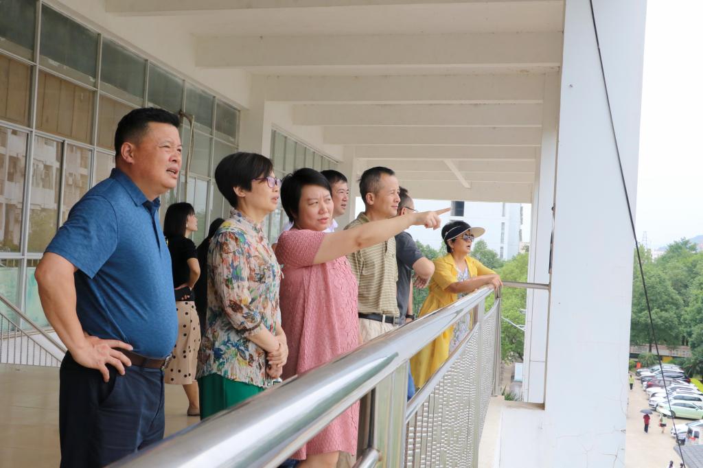 座谈结束后,肖笛波一行在诸葛长、杨庆庆等陪同下,沿臻善环道实地参观了校园及独秀书房,并在乐膳食府三楼楼梯平台驻足,进一步听取、了解校园二期建设项目进展情况。