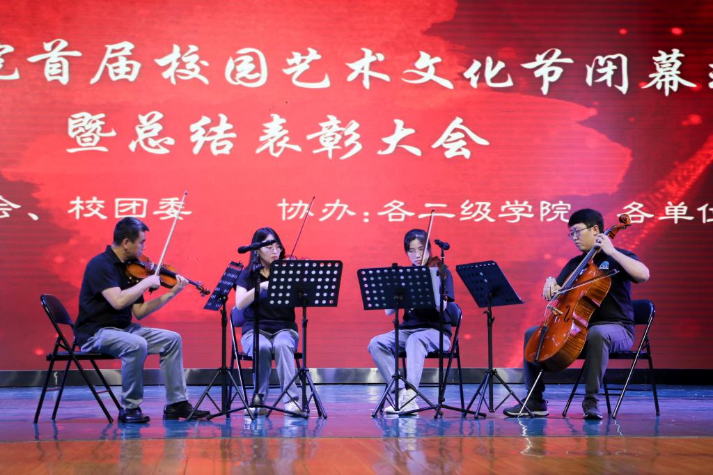 6月26日下午,为进一步强化学校美育育人功能,构建德智体美劳全面培养的教育体系,表彰在首届校园艺术文化节中表现突出的先进集体和优秀个人,我校在弘善讲堂隆重举行首届校园文化艺术节闭幕式暨总结表彰大会。校领导杨树喆、邓志平、杨庆庆、何玲,至善管弦乐团相关负责人,各二级学院院长、党总支副书记、团总支书记及学生代表共同参加本次活动。