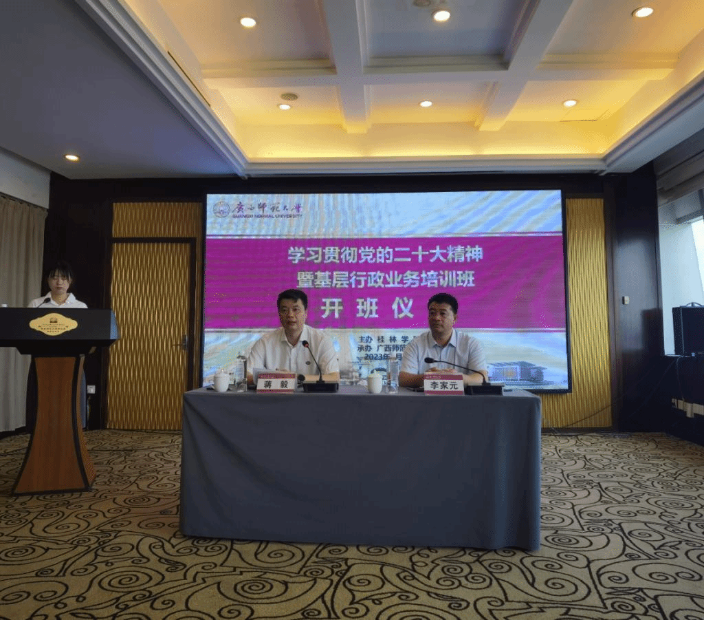 学校副校长蒋毅,广西师范大学继续教育学院院长李家元出席开班仪式。蒋毅在开班动员时表示学校高度重视本次培训,希望通过培训加强基层行政党务人员能力,提升专业化、职业化水平,要求参训人员提高认识,把培训的内容学深悟透,并自觉运用到实际工作中去,把学习成果转化为高效的执行能力,切实推进学校各项事业新发展。