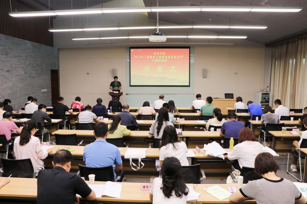 唐文红作研修总结讲话。在讲话中,她对承办本次研修班的百色干部学院的精心组织和倾心服务表达了感谢,对为本次研修班辛勤劳动的工作人员给予了肯定,对全体学员圆满完成学习任务表示祝贺。她从以高质量党建开创桂林学院建设新格局、以高质量党建引领新时代高素质教师队伍建设、以高质量党建赋能教育教学质效同增、以高质量党建引领至善校园文化建设四个方面总结了学校2023年春季学期工作取得的成效。为做好秋季学期工作,她对全体学员提出了四点希望:一是始终坚持旗帜鲜明讲政治,永葆对党绝对忠诚之心。面对即将启动的学习贯彻习近平新时代中国特色社会主义思想主题教育,要始终把对党忠诚摆在首位,将本次研修培训成果转化为应对风险挑战、推动工作发展的治理能力和工作水平。二是始终坚持守正创新扬优势,永葆奋发进取之心。要敢于直面学校发展中亟待优化的问题,做到谋划发展有思路、破解难题有办法、改革创新有实招,切实推动各项工作任务有效落实。三是始终坚持严于律己守底线,永葆敬畏规矩之心。要强化自律意识,始终保持对党纪国法的敬畏之心,谨言谨行,保持警醒,正确处理好公与私、廉与腐、苦与乐的关系。四是落实全区教育系统意识形态和安全稳定工作会议精神。要始终坚持师生至上,生命至上,时刻绷紧安全稳定这根弦,把工作责任落实到每个环节、每个岗位、每个人员,形成闭环责任落实机制,共同筑牢学校意识形态和安全稳定工作的每一道“防火墙”。