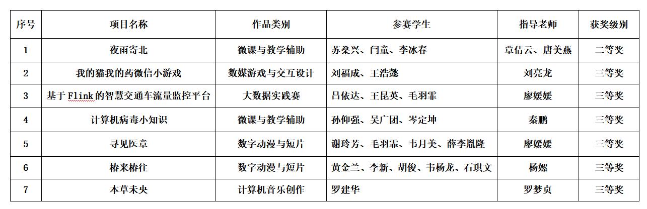 近日,2023年(第16届)中国大学生计算机设计大赛圆满落幕。我校“夜雨寄北”、“我的猫我的药微信小游戏”、“基于Flink的智慧交通车流量监控平台”等7件作品分别获得微课与教学辅助、数媒游戏与交互设计、大数据实践赛等5个不同类别的二等奖和三等奖,获奖类别覆盖面广,获奖数量高于区内同类院校。