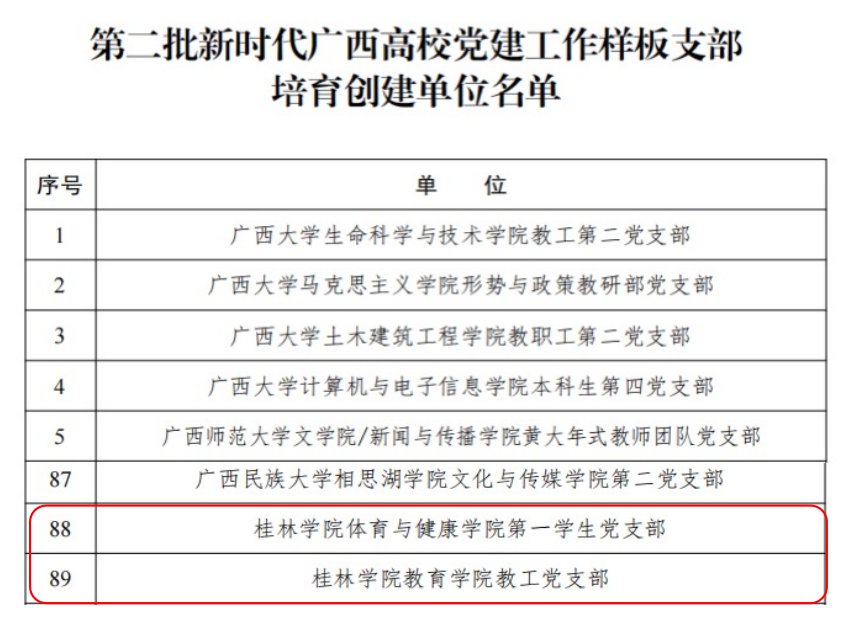 近日,自治区党委教育工委公布第二批新时代广西高校党建示范创建和质量创优工作评选结果,我校教育学院教工党支部、体育与健康学院第一学生党支部荣获全区高校党建工作样板支部培育创建单位。