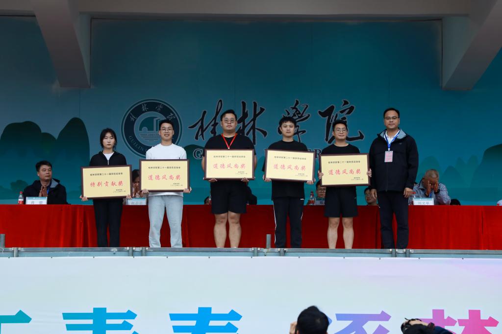 在热闹非凡的舞狮表演和精彩灵动的彩带龙表演之后,体育与健康学院副院长、校体委委员、本届运动会总裁判长涂海宁宣读了本届田径运动会比赛团体总分及名次;学生事务处(部)长、道德风尚组长江仿宣布了第二十一届田径运动会道德风尚奖、特殊贡献奖评比结果,及第四届体育文化节优秀组织奖单位名单。校领导依次为获奖单位颁奖。