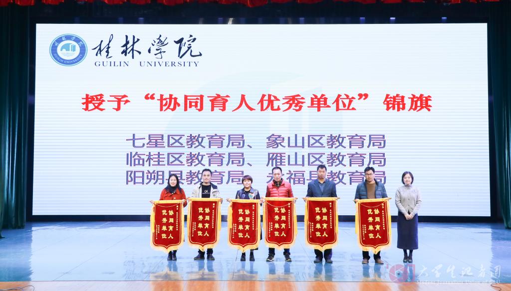 开幕式上,杨树喆、陈念进、张怀伟分别为我校与桂林市教育局、广东惠州市博罗县教育局共建的“师范专业协同育人中心”揭牌。邓志平、祝芸芸代表我校向40个被评为“师范专业协同育人优秀单位”的县(区)教育局、校外实践教学基地(学校)颁发锦旗。