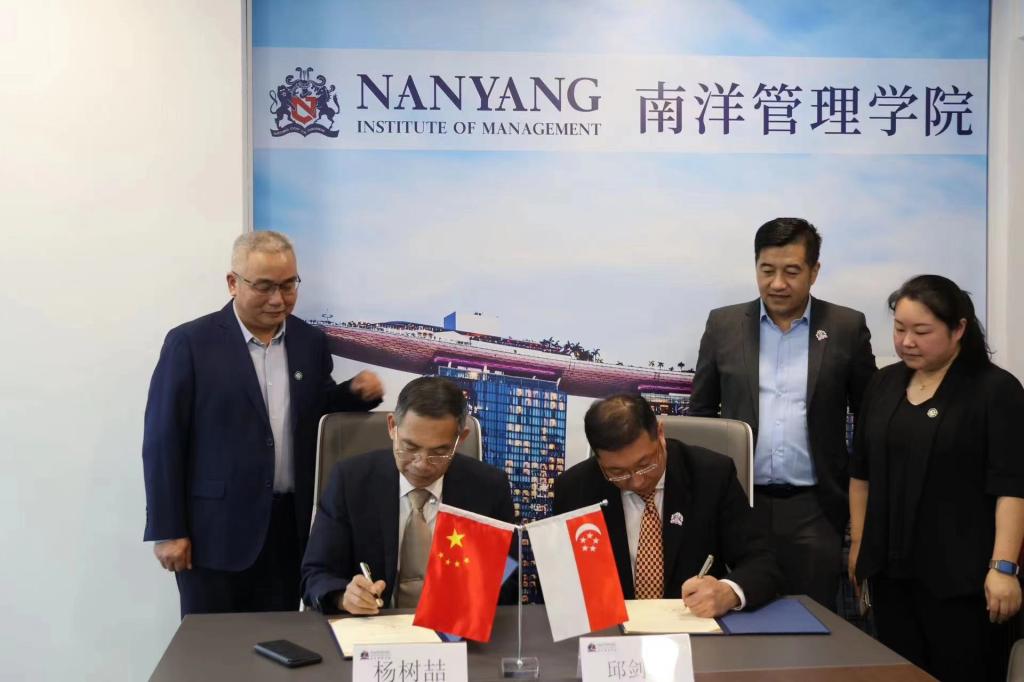 访问南洋管理学院期间,代表团一行对该校进行实地走访,深入了解该校专业设置、人才培养、学生留学服务等情况。南洋管理学院院长助理James Zhang、旅游与酒店管理学院院长邱剑辉、高级行政主任Grace Du等参加会谈。James Zhang向代表团详细介绍了该校的办学历史和成效及留学新加坡的优势等,表达了在工商管理、旅游管理、幼儿保育与教育基础等领域与我校开展合作的强烈意愿。杨树喆表示,我校高度重视与新加坡高校的合作与交流,希望以本次访问为契机,建立起两校的友好合作关系,在教师互访、学生学历和非学历留学项目、联合开展国际学术会议等方面开展深层次务实合作。杨树喆和邱剑辉代表两校签署了合作谅解备忘录。