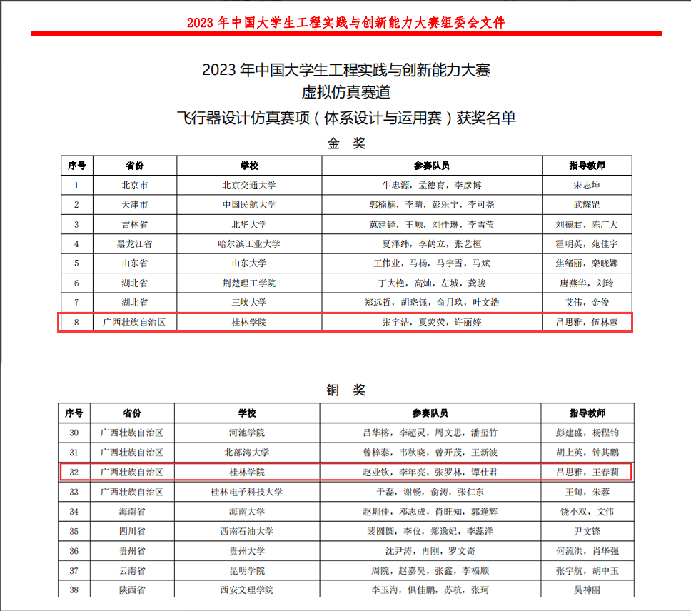 中国大学生工程实践与创新能力大赛是全国工程创新实践类规模最大和影响力最大的竞赛。本次北京航空航天大学赛场汇集来自全国30个省 (自治区、直辖市)的73所高校的82支代表队300余名优秀学子在飞行器设计仿真赛项中同场竞技。广西17余所高校共推出12支优秀代表队参加全国总决赛,其中我校被推2支参赛队参与飞行器设计仿真赛项飞行器体系设计与运用赛(全区共5支队伍晋级飞行器体系设计与运用赛)。通过与来自北京航空航天大学、上海交通大学、中国计量大学等包括985高校在内的全国39所41支队伍进行角逐,我校有一支队伍(吕思雅、伍林蓉老师指导,管理工程学院张宇洁、夏荧荧、许丽婷同学参加)以全国第4名的成绩斩获国家金奖一项,另一支队伍(吕思雅、王春莉老师指导,管理工程学院赵业钦、李年亮、张罗林、谭仕君)荣获国家铜奖一项的佳绩。本次获奖,充分展示了我校在创新创业教育方面的成果。未来我校将继续坚持“以赛促教、以赛促学、以赛促创”,培养更多具有创新精神和实践能力的优秀人才。