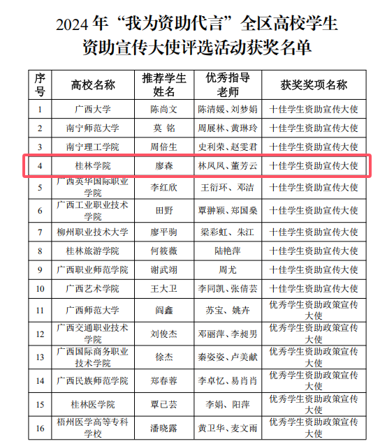 近日,自治区教育厅关于公布2024年“我为资助代言”全区高校学生资助宣传大使评选活动获奖名单,全区高校共20名选手参赛,我校2021级播音与主持艺术专业学生廖森荣获“十佳学生资助宣传大使”称号。