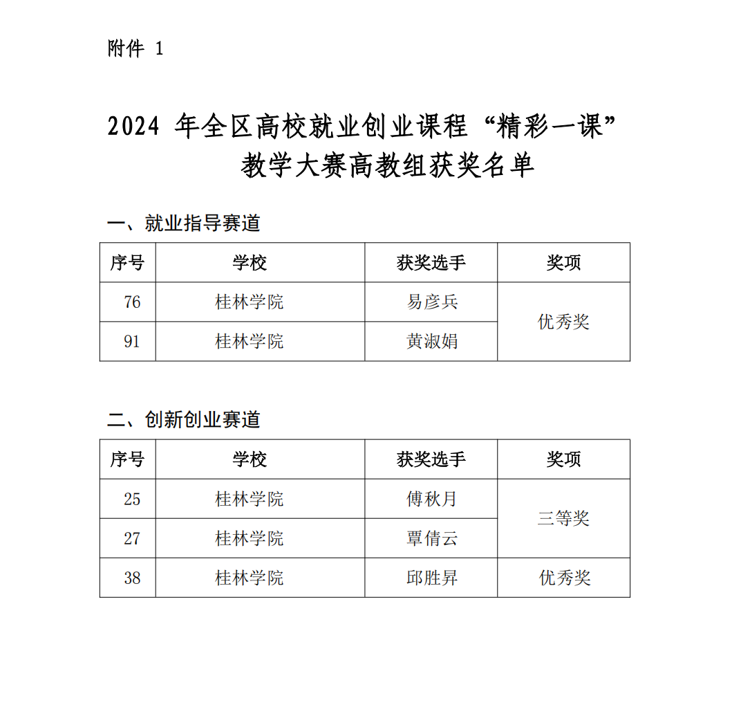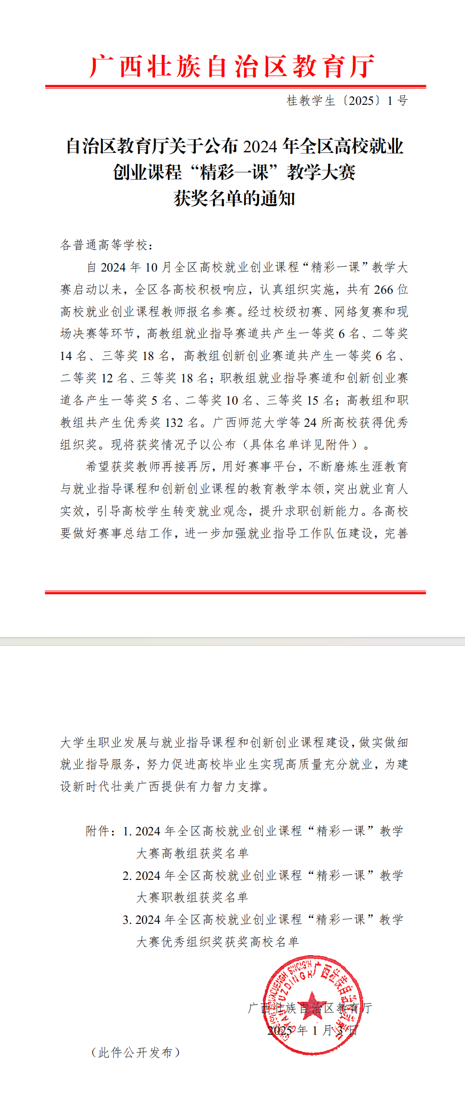 近日,自治区教育厅公布2024年全区高校就业创业课程“精彩一课”教学大赛获奖名单。我校教师覃倩云、傅秋月获创新创业赛道三等奖,邱胜昇获优秀奖;易彦兵、黄淑娟获就业指导赛道优秀奖。
