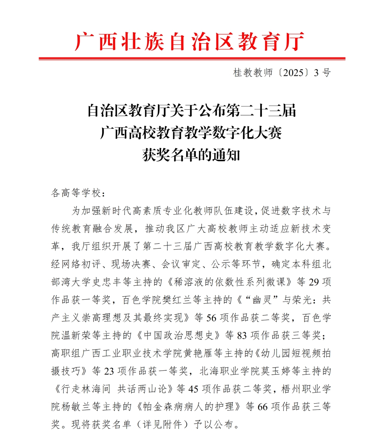 近日,自治区教育厅公布了第二十三届广西高校教育教学数字化大赛获奖名单,本次比赛我校教师获得一等奖一项、二等奖两项、三等奖一项。