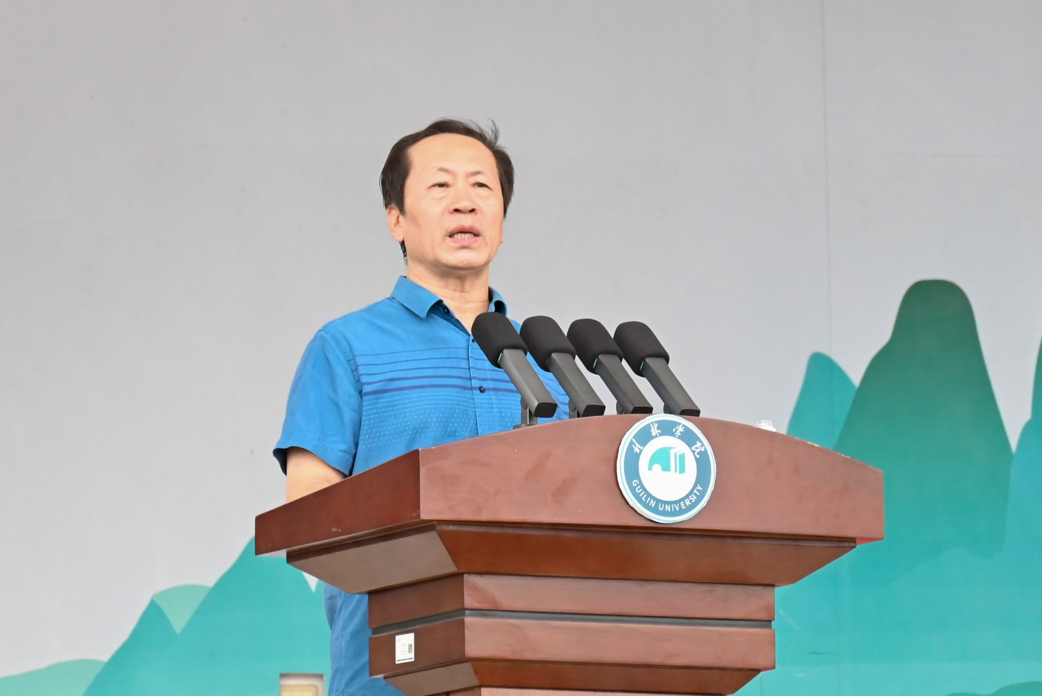 鹰击天风壮,鹏飞海浪春。9月9日上午,桂林学院2025级新生开学典礼在田径场隆重举行。近3000名新生汇聚一堂,赓续桂林学院“向学、向善,自律、自强”的精神血脉,以青春之我、奋斗之我,共同开启属于新“桂院人”的青春篇章。桂林警备区司令员骆明忠大校,陆军特种作战学院六大队大队长陈明元上校,桂林警备区动员处处长刘晖上校,雁山区人武部政委蒋文才上校,校领导吴郭泉、康庚莲、杨庆庆、何玲、蒋毅等出席典礼。典礼由副校长蒋毅主持。