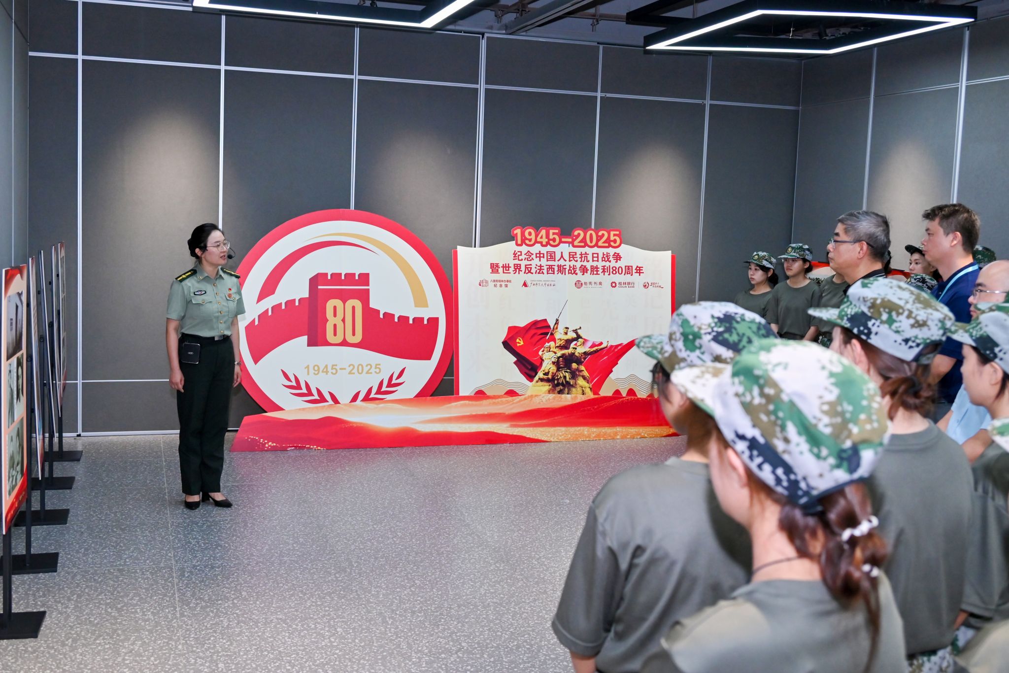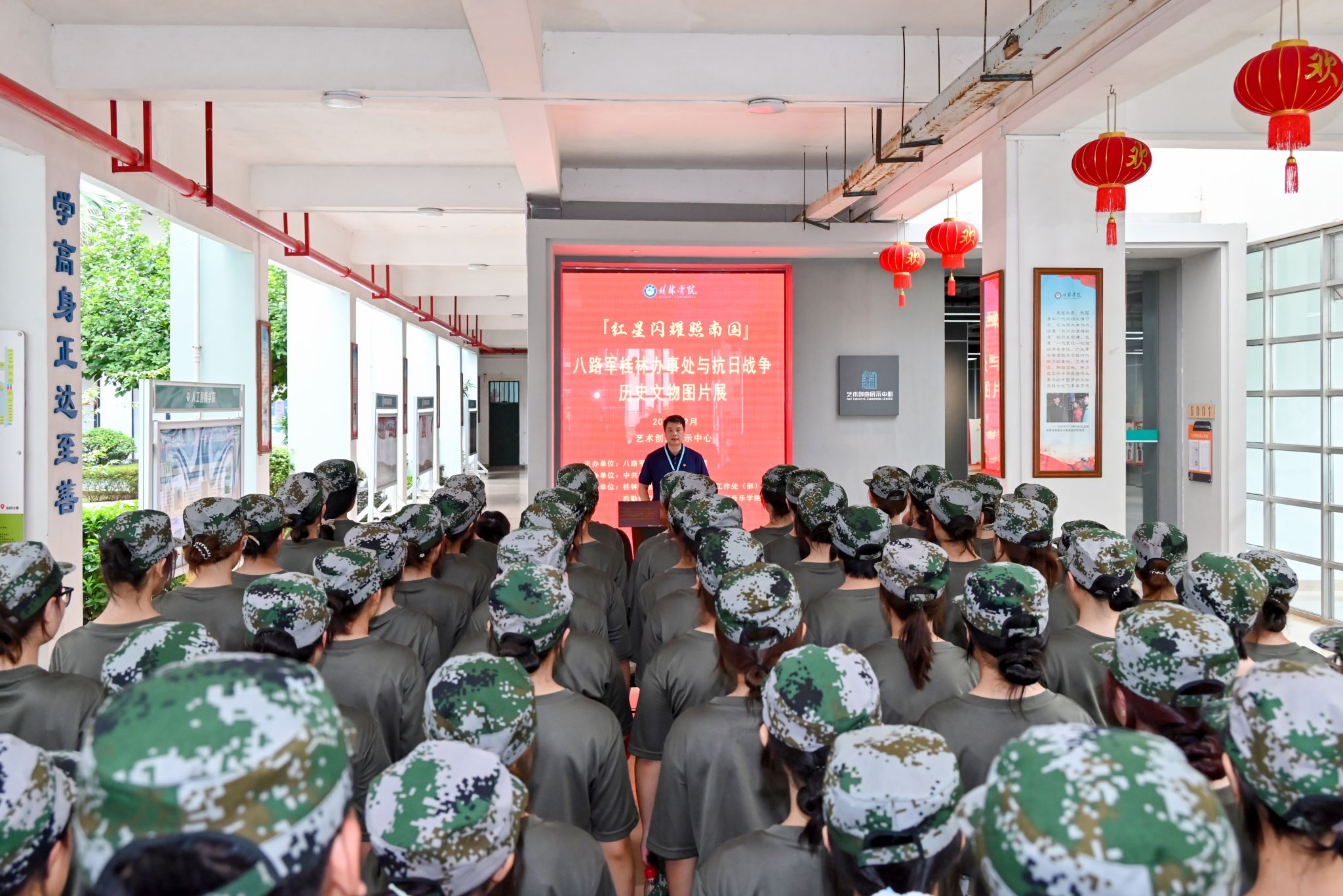 为纪念中国人民抗日战争暨世界反法西斯战争胜利80周年,9月11日上午,“红星闪耀照南国——八路军桂林办事处与抗日战争历史文物图片展”在学校艺术创意展示中心隆重开幕。本次展览由八路军桂林办事处纪念馆主办,校党委承办,校党委宣传部、学生工作处(部)、后勤保卫处、教育与音乐学院、红话筒理论宣讲辅导员工作室及桂林银行叠彩支行协办。八路军桂林办事处纪念馆馆长时建红,学校副校长蒋毅,桂林银行叠彩支行行长蒋扬帆及相关负责人出席开幕式,首批观展的70余名师生代表参加开幕式。