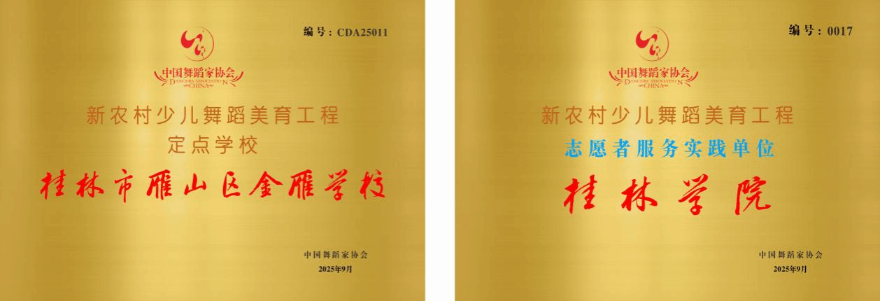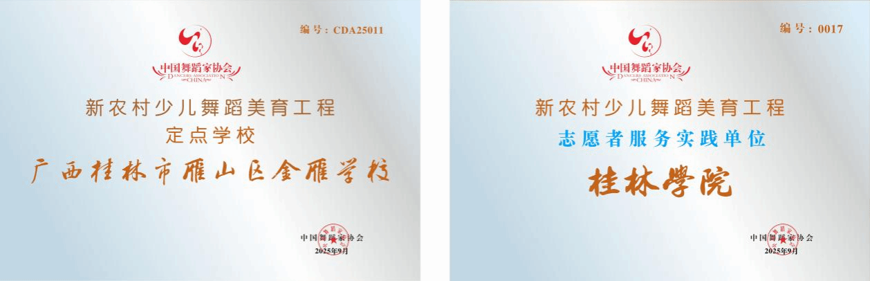 为贯彻落实美育浸润乡村要求、推进乡村文化振兴,缩小城乡少儿艺术素养教育的差距,中国舞蹈家协会和广西舞协携手在广西实施新农村少儿舞蹈美育工程。经中国舞蹈家协会和广西舞协联合考察与实地走访以及现场教学测试,最终确定桂林学院为“新农村少儿舞蹈美育工程”志愿者服务实践单位,由桂林学院提供舞蹈学专业志愿者,定期帮助金雁学校对学生进行舞蹈教学和训练。工程实施周期为3年,中国舞蹈家协会提供一定形式的支持和保障,以提高少儿艺术素养和舞蹈水平,从而达到美育浸润乡村,振兴乡村文化的目的。
