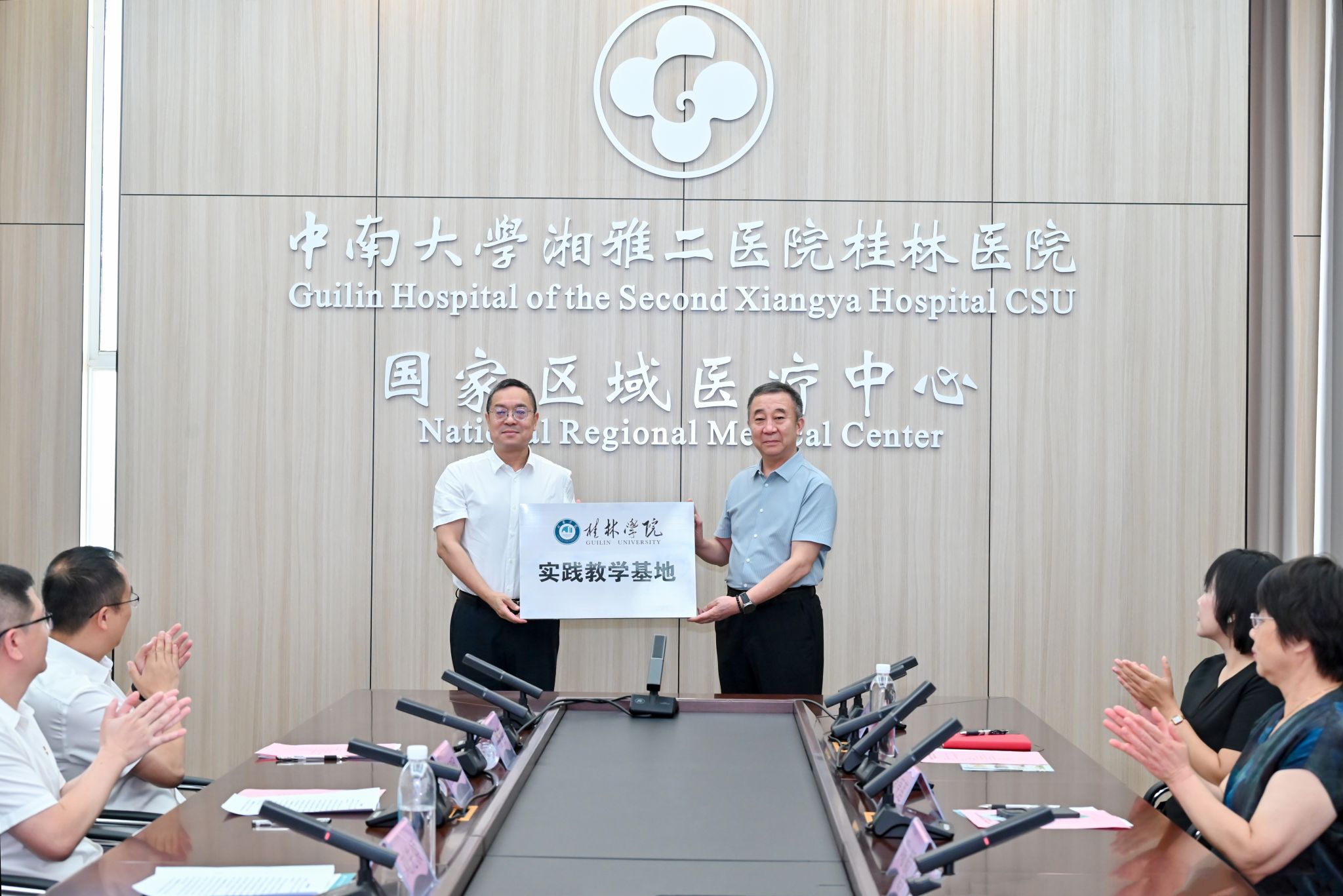 会上签订了《桂林学院与中南大学湘雅二医院桂林医院战略合作框架协议》,并为“桂林学院实践教学基地”揭牌。根据协议双方将着重推进:优势互补,高校教育与临床实践融合;填补人才缺口,助推地方大健康产业升级;医教研协同,推动学科建设与成果转化等领域的工作。陶毅表示,此次框架协议的签订是桂林学院深入贯彻市委、市政府决策部署的关键举措,希望学校充分发挥应用型高校的特色优势,立足桂林、服务桂林、建设桂林,紧密对接广西及桂林在医疗大健康领域的实际需求,加强关键核心技术协同攻关、人才培养,不断推动医教深度交叉融合。