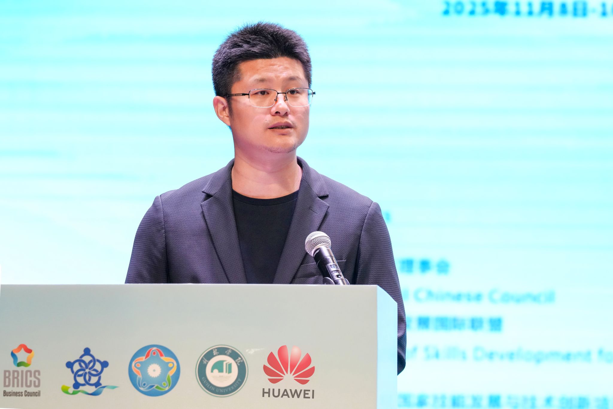 华为云云学堂负责人唐国军在开幕式上致辞,他围绕鸿蒙端云智能应用开发的行业前景展开,指出随着数字经济的快速发展,鸿蒙生态对专业技术人才的需求日益迫切。此外,他还介绍了贯穿本赛项的华为云学堂和华为开发者空间,并强调将持续在这些平台上优化课程内容和实践环境,让内容更贴近产业需求,让开发环境更便捷高效,让每一位开发者都能在这里找到适合自己的成长路径。未来华为云将持续深化与高校的合作,为鸿蒙生态建设与数字产业发展输送更多优质人才。
