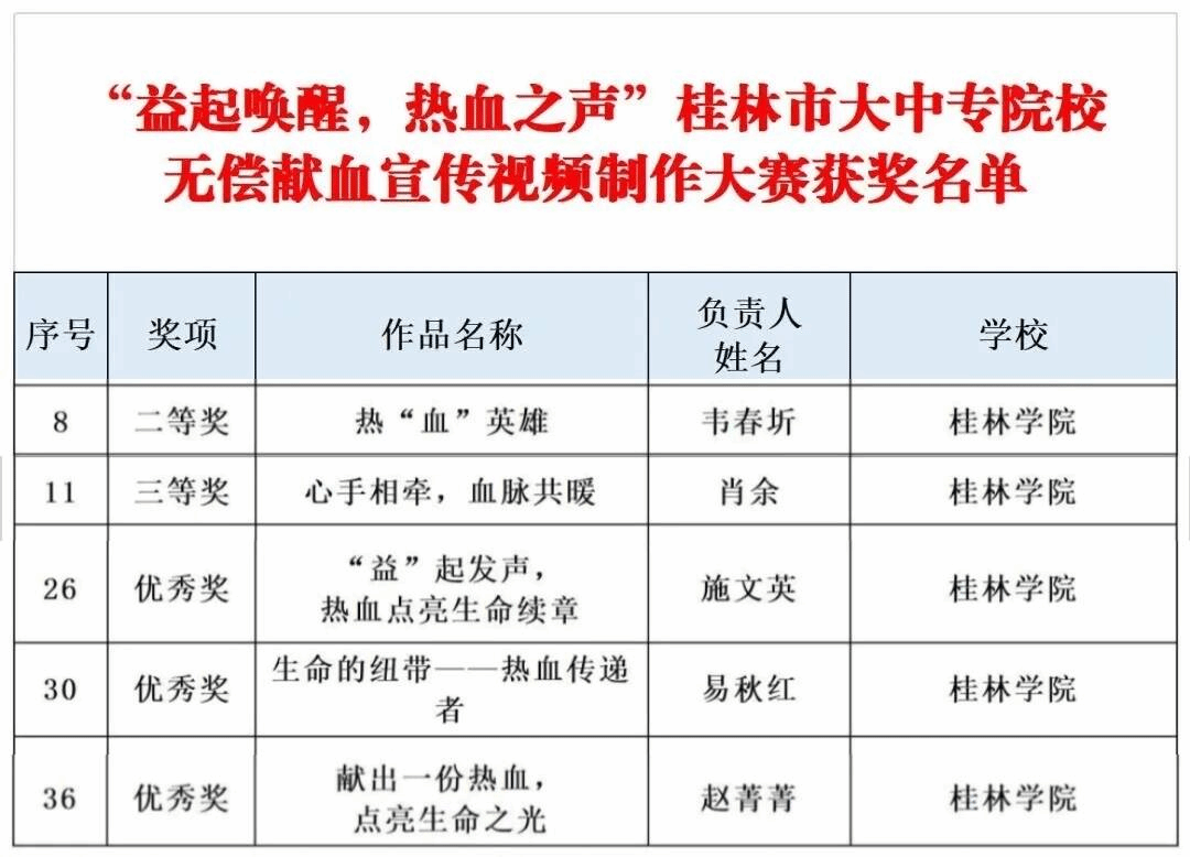 近日,由桂林市卫生健康委员会、桂林市红十字会、共青团桂林市委员会主办,桂林市中心血站、桂林理工大学承办的“益起唤醒,热血之声”桂林市大中专院校无偿献血宣传视频制作大赛获奖名单公布。我校学生作品《热“血”英雄》在此次大赛中荣获二等奖,作品《心手相牵,血脉共暖》荣获三等奖,作品《“益”起发声,热血点亮生命续章》《生命的纽带——热血传递者》《献出一份热血,点亮生命之光》荣获优秀奖。