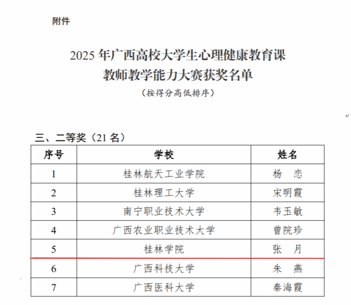 近日,广西壮族自治区教育厅公布了2025年广西高校大学生心理健康教育课教师教学能力大赛获奖名单,本次比赛全区高校共有85名心理健康教育课教师参赛,我校学生心理健康教育与咨询中心专职教师张月获大赛二等奖。
