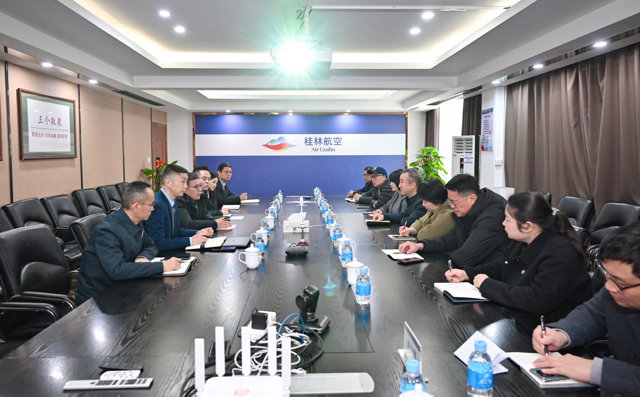桂林航空运行控制部、维修工程部、客舱服务部、人资行政部,学校办公室、产教融合与创新创业中心、科研与社会合作处、文化与传媒学院、工商管理学院、信息工程学院相关负责人陪同参加考察交流。