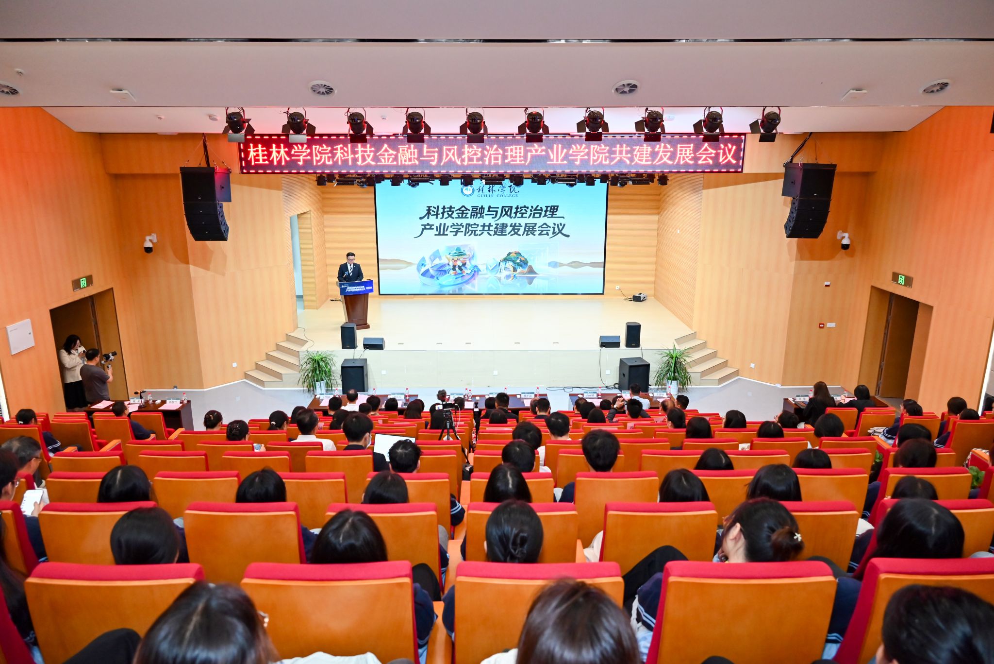 启动仪式上,校长吴郭泉、桂林市银行业协会专职副会长熊平海、桂林保险行业协会常务副会长兼秘书长曾磊、桂林银行桂林分行领导蔡晔等共建单位代表共同上台,启动科技金融与风控治理产业学院建设,标志着校协企三方合作迈入新阶段。