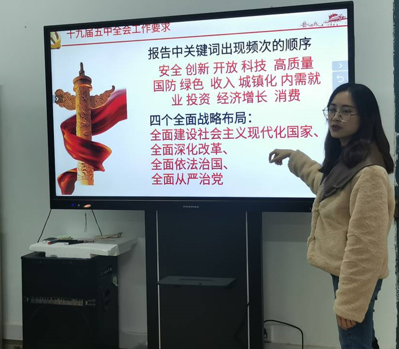图:团总支副书记蓝贤斯传达党的十九届五中全会精神